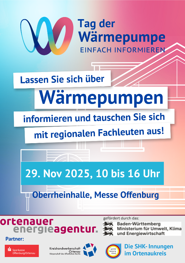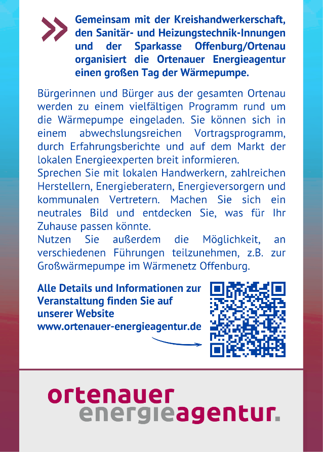 Der Tag der Wärmepumpe wird organisiert von der Ortenauer Energieagentur in Kooperation mit der Kreishandwerkerschaft, den Sanitär- und Heizungstechnik-Innungen und der Sparkasse Offenburg/Ortenau.